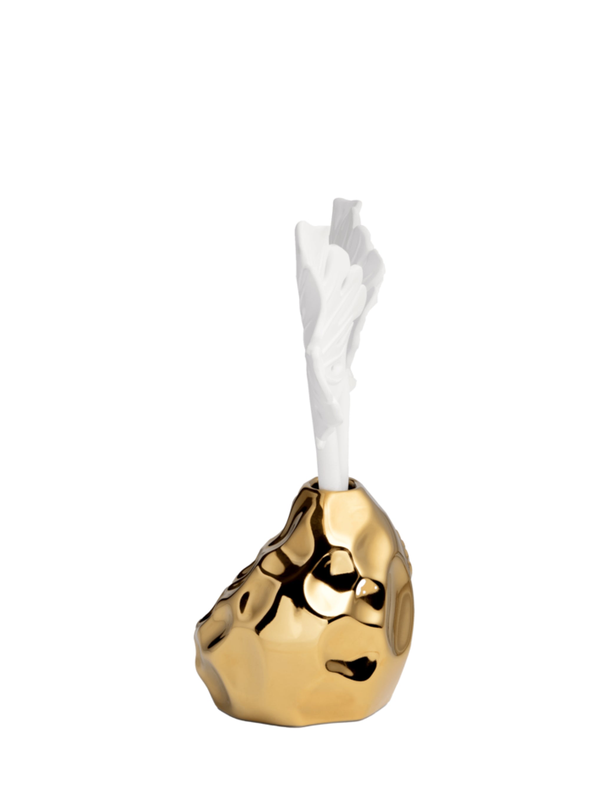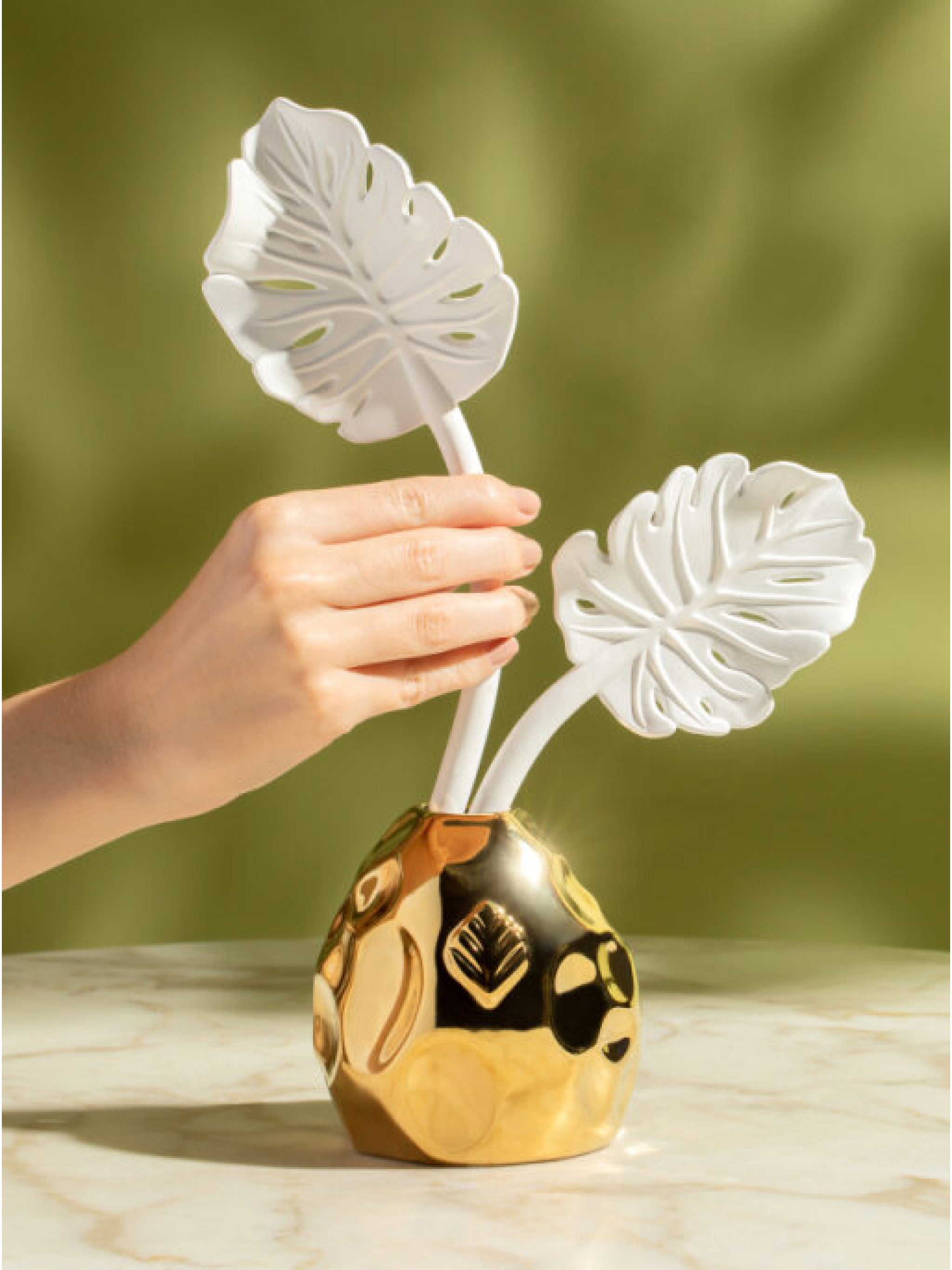 This porous porcelain and gold diffuser is modeled after the tropical Adam's Rib leaf or Monstera leaf; a plant abundant in Bulhões’s native Brazil. Accompanied by the Figo Negro scent, it adds a statement to any surrounding while slowly emitting a welcoming scent for up to four months.