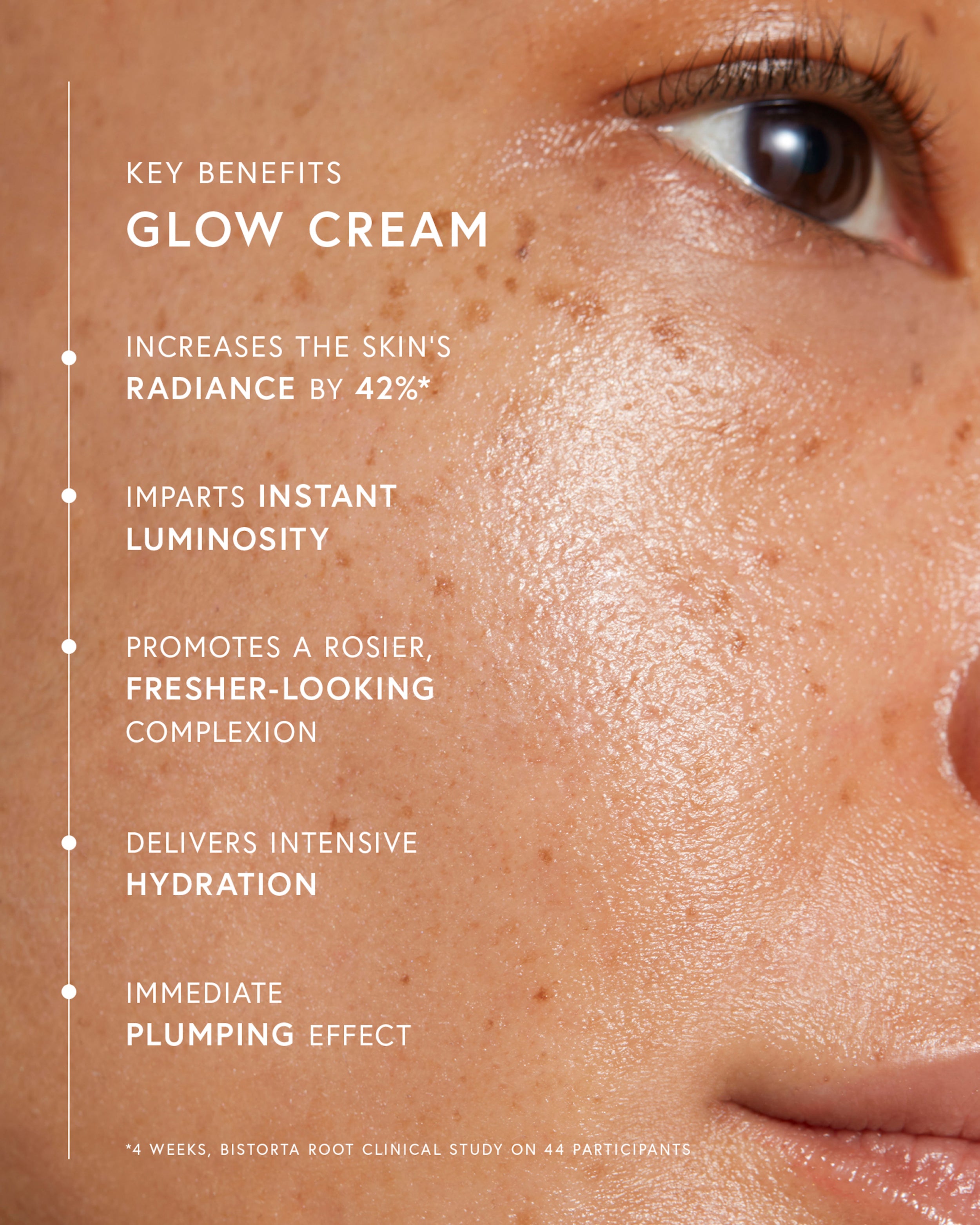 Powered by cutting-edge ingredients like bistorta root extract, triple hyaluronic acid, and light-reflecting pearl pigments, Glow Cream delivers both immediate and long-term skin benefits. Add to your daily routine to boost your glow, soften lines, and enhance your skin’s youthful vitality.