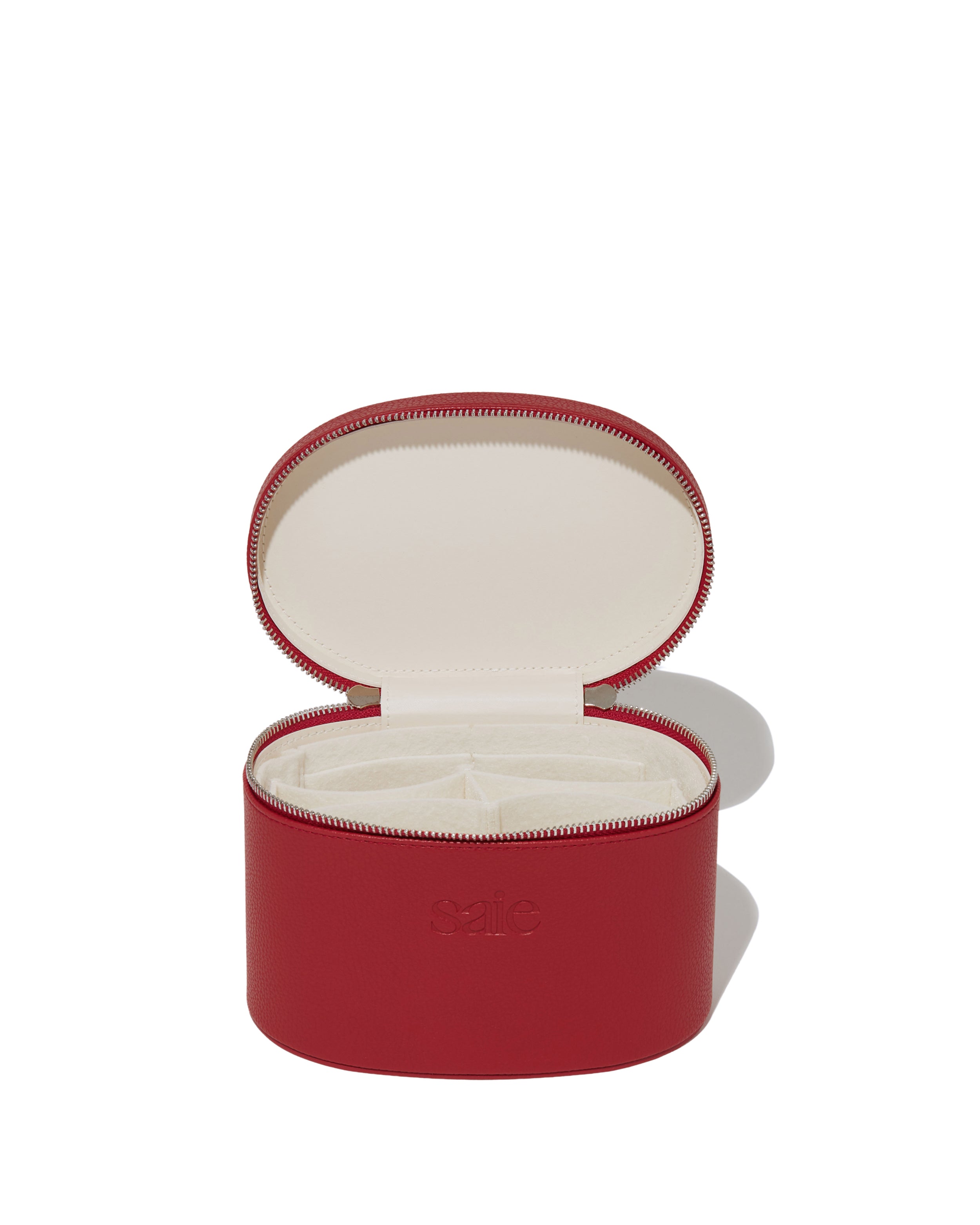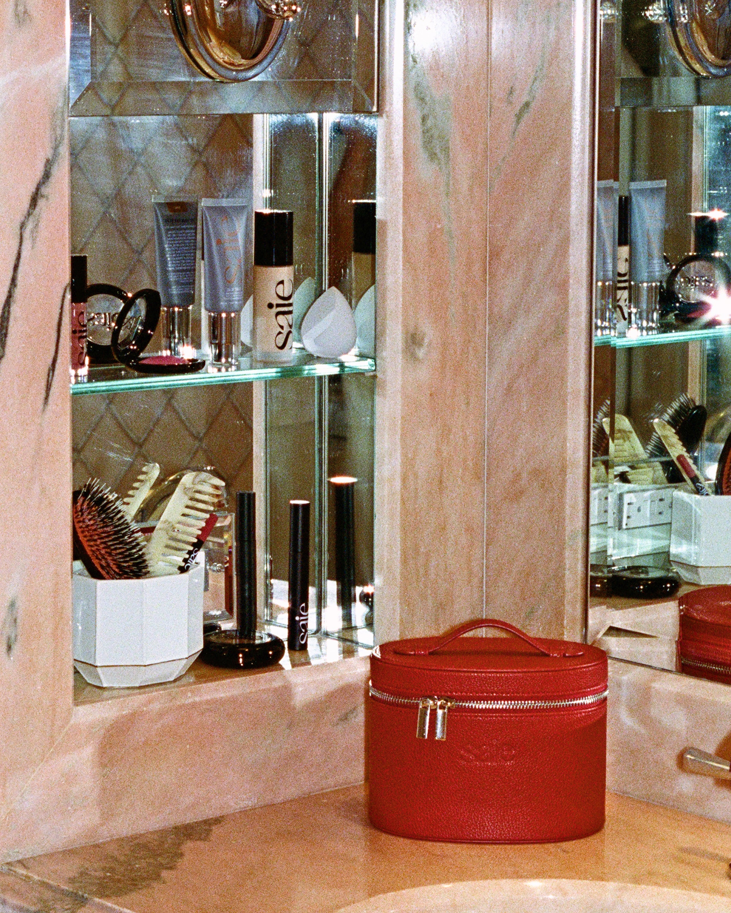Saie’s compact travel case fits a multitude and makes for a chic gift—for yourself or others. Find it in eye-catching red only at VIOLET GREY.